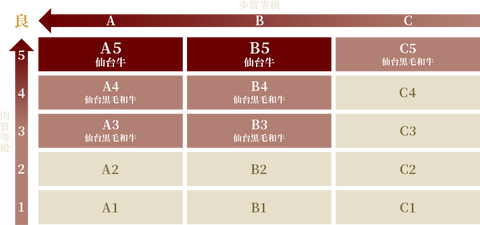 Attualmente, il manzo di Sendai è l'unico marchio in Giappone che ha una certificazione rigorosa solo per la carne con BMS di qualità più elevate. Inoltre, la carne classificata come C5-B3 è chiamata manzo nero di Sendai.
